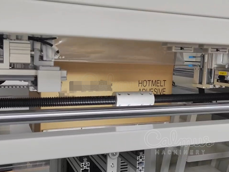 Calmus Machinery’s bag uncuffer and top roller machines are designed to roll up bag tops inside boxes after hot-melt adhesive pellets are loaded. This bag uncuffer roller uncuffs the bag from the top flaps of the carton, stretches the bag opening, and applies a gentle vacuum to prevent ballooning. It then rolls up the top of the bag and applies a adhesive label to securely seal it, ensuring that products are securely packaged for storage or shipment. The machine can also be integrated with heat-sealing functionality upon request for additional versatility.