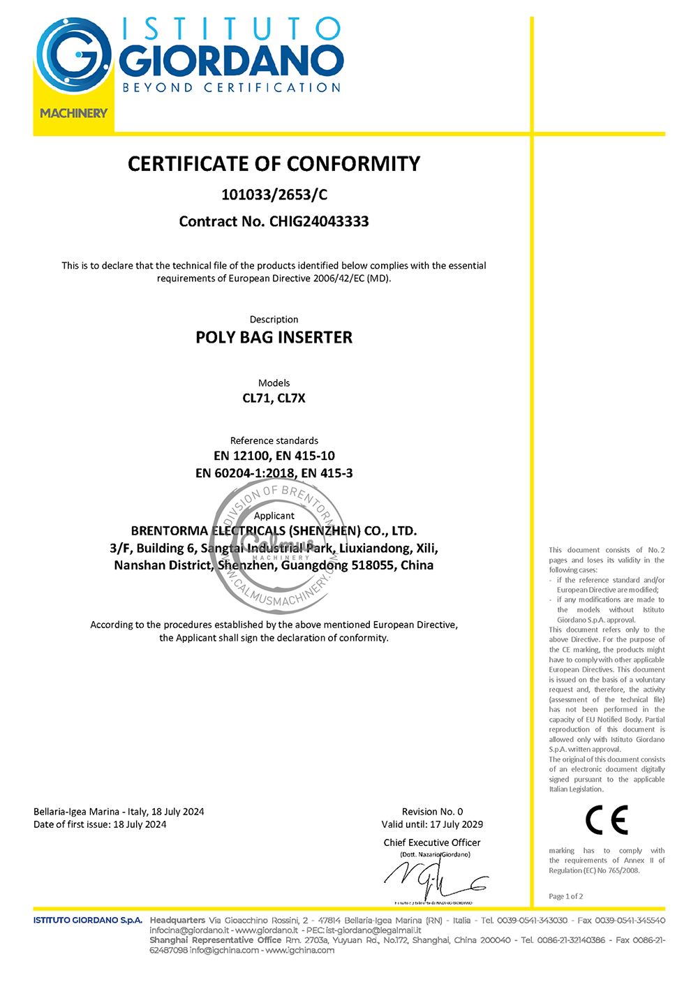 Calmus Machinery heeft in juli 2024 CE-certificering verkregen van Istituto Giordano voor onze Zakkeninlegmachines CL71 en CL7X. Deze certificering voldoet aan de volgende machinerichtlijnen: EN 12100, EN 415-10, EN 60204-1:2018 en EN 415-3.